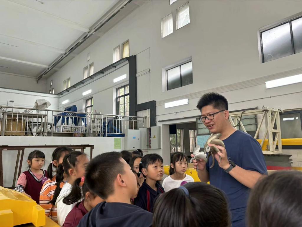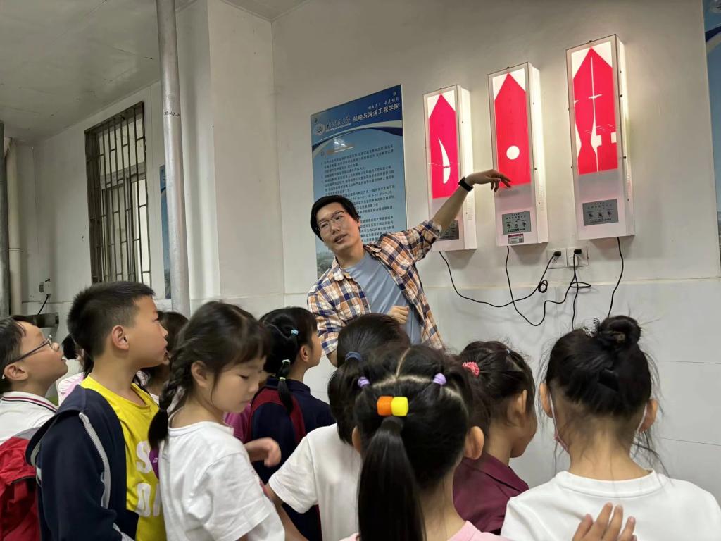 在纪念海军成立的日子里,2024年4月25日,华中科技大学附属小学206班、403班学生走进565net必赢客户端实验中心,开展舰船科普知识实践。565net必赢客户端实验中心主任冯大奎教授、高级工程师宋磊、工程师陈浩带领学生先后参观了舰船模型展厅、流体力学实验室、船模拖曳水池。
